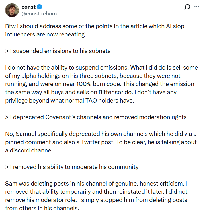 Covenant AI сообщил, что за последние недели Стивс предпринял несколько действий против проекта, включая приостановку эмиссии в свою подсеть, ограничение полномочий по модерации в каналах сообщества и применение «прямого экономического давления» посредством видимых продаж токенов во время спора.
